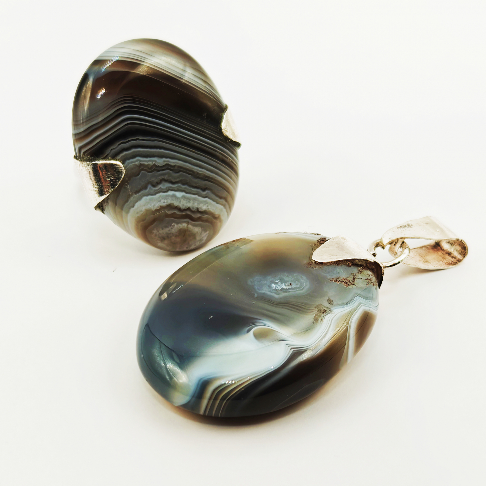 Un set din Agat montat în argint, cu pandantiv și inel reglabil, este alegerea perfectă pentru cei care apreciază bijuteriile naturale și versatilitatea designului elegant.