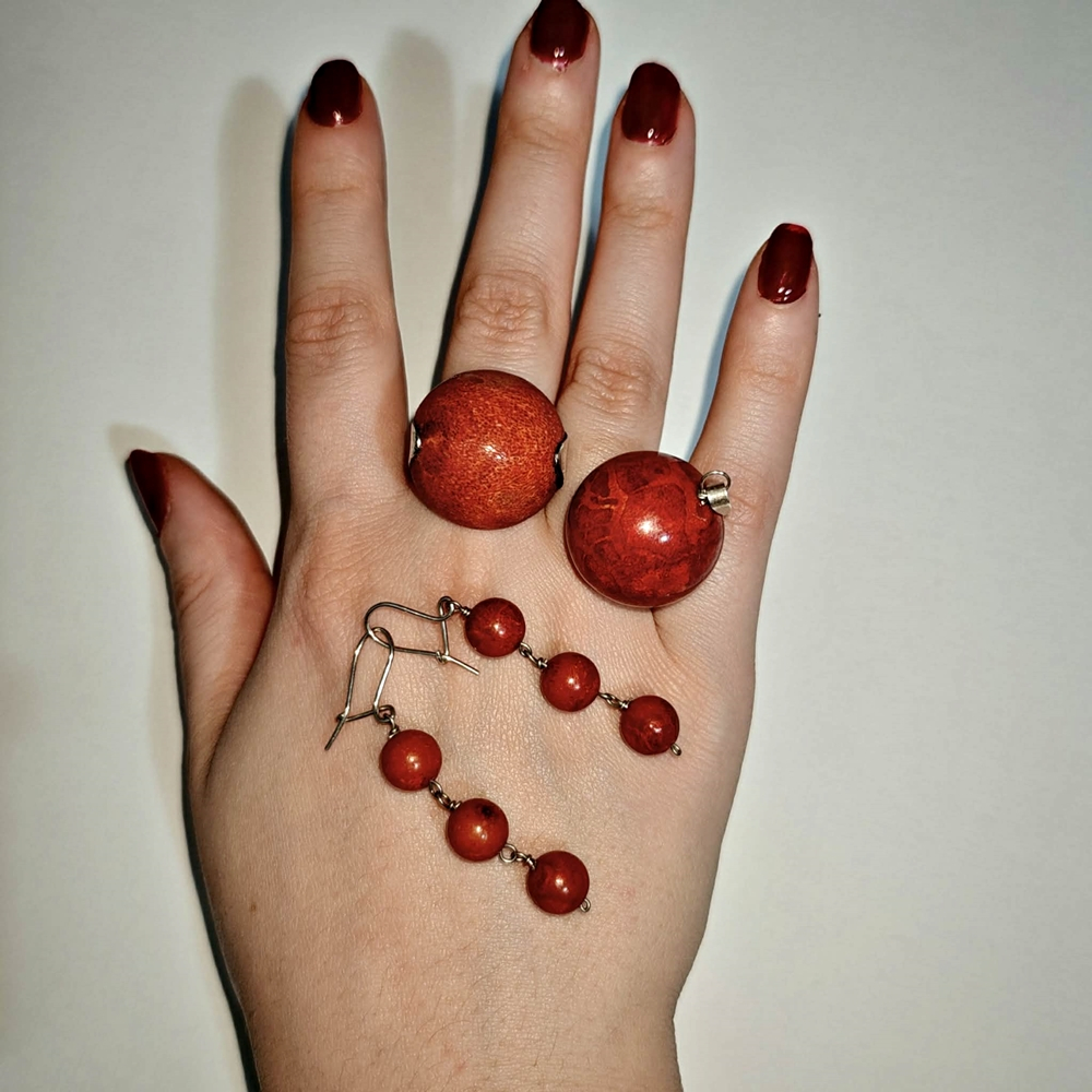 Descoperă eleganța naturală a mării cu acest set rafinat de bijuterii, alcătuit din pandantiv, inel și cercei cu tortiță, toate realizate manual din argint 925 și înfrumusețate cu coral spongios autentic.
