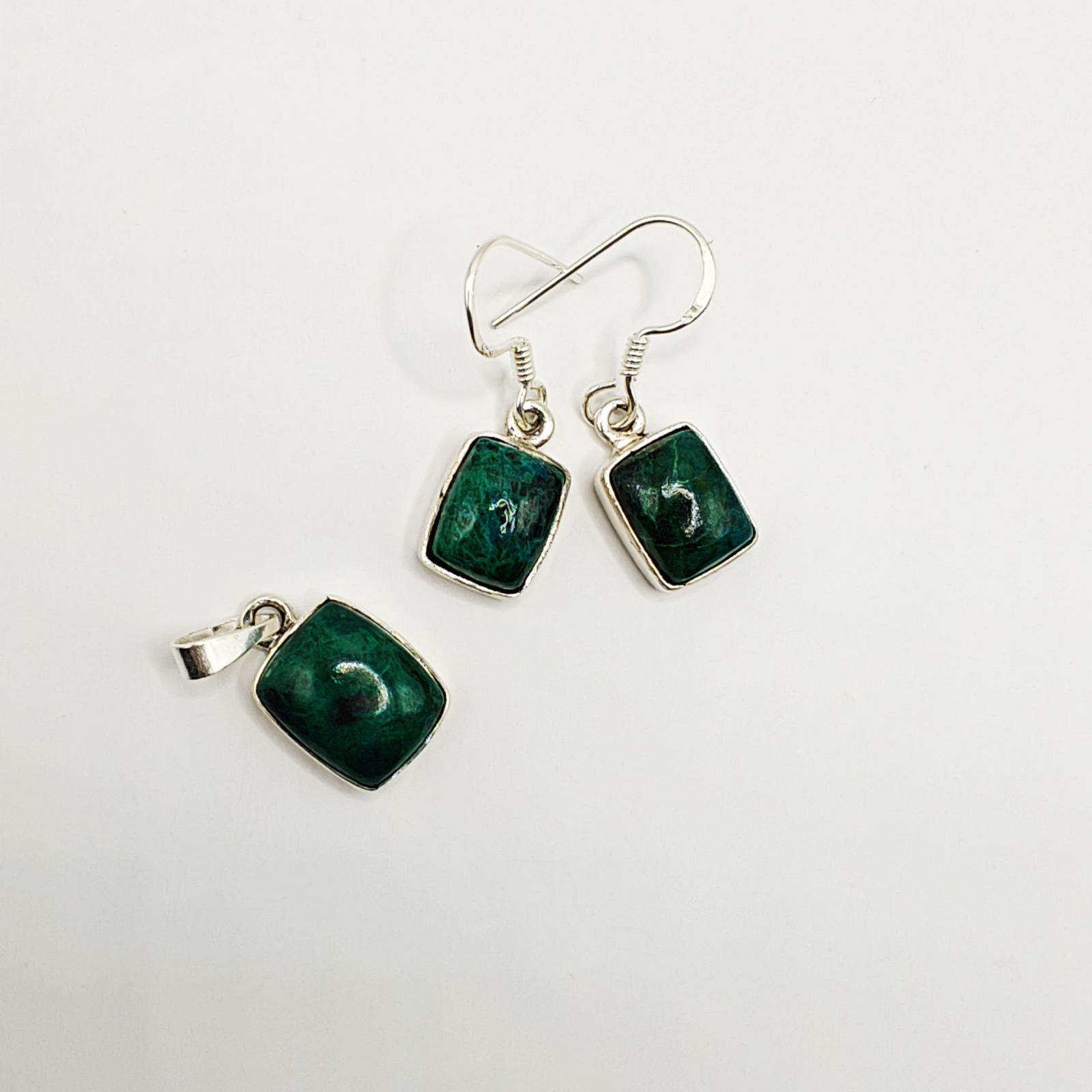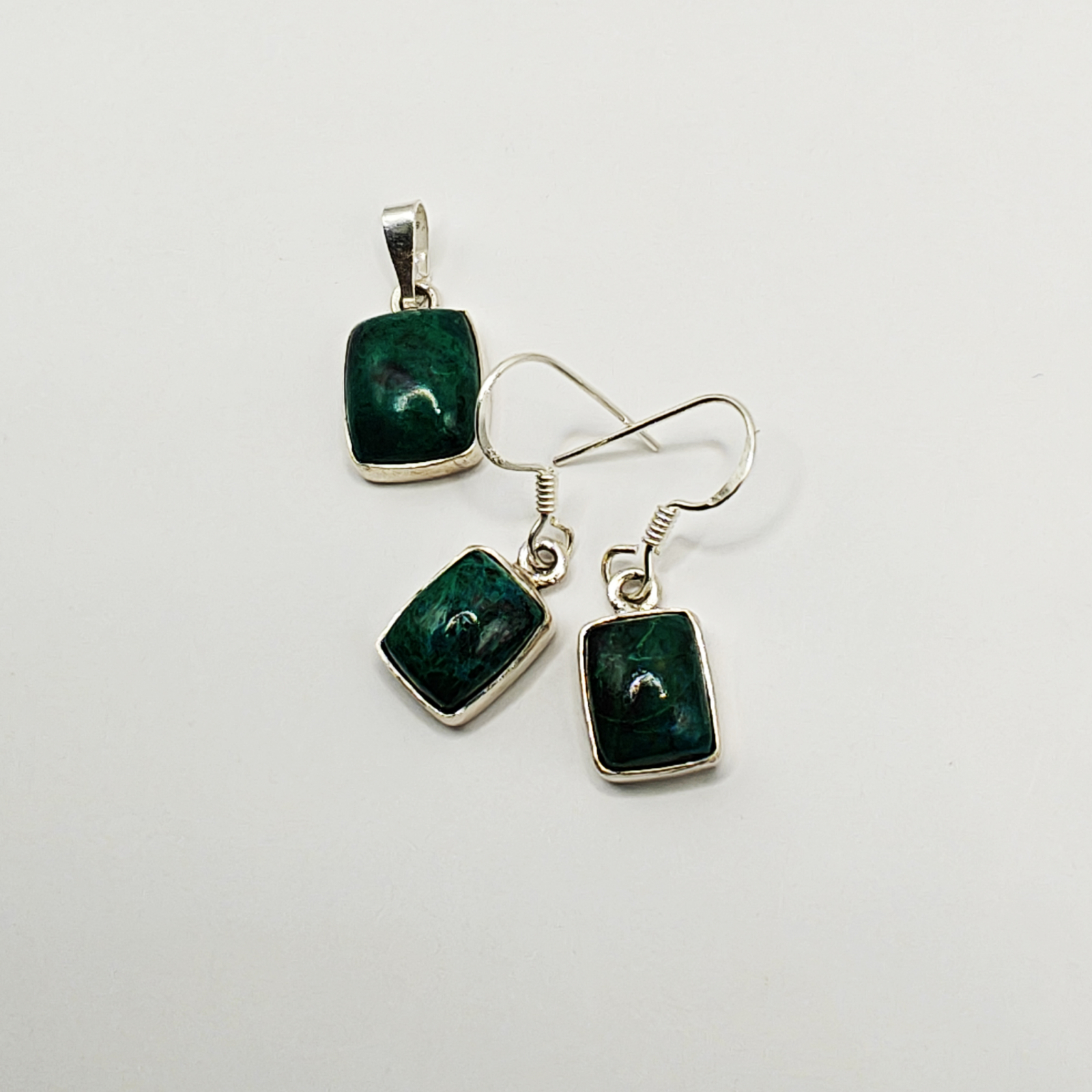 Set Crisocola, tăietură cabochon - pandantiv și cercei, în argint
