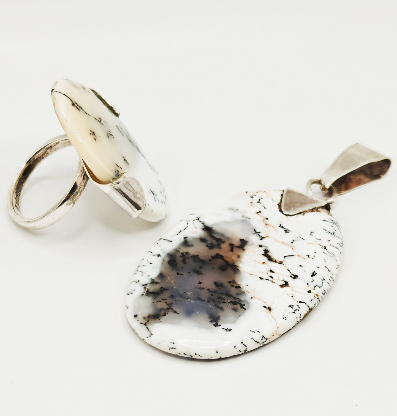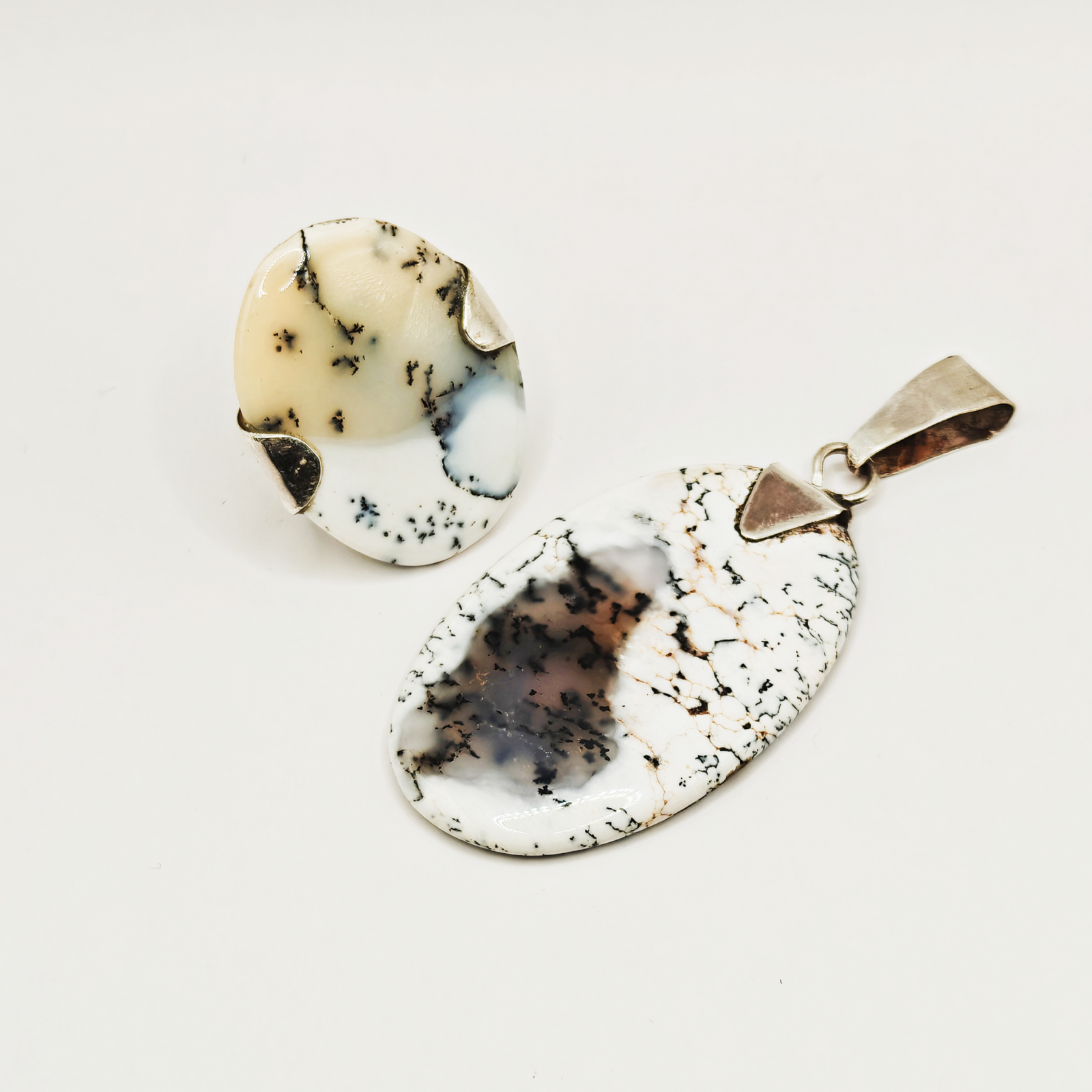 Un set din opal dendritic montat în argint, cu pandantiv și inel reglabil, este alegerea perfectă pentru cei care apreciază bijuteriile naturale și versatilitatea designului elegant.